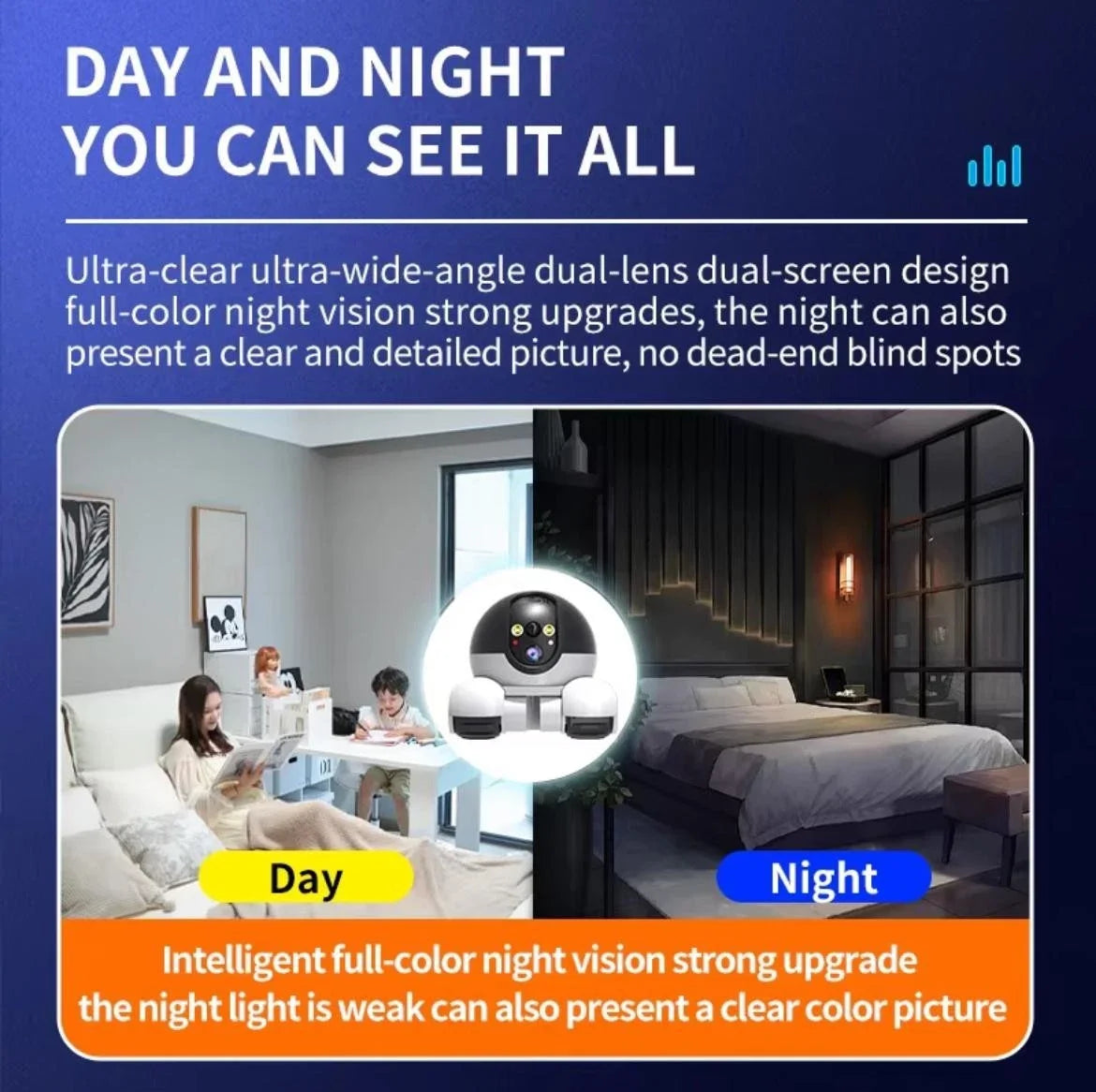 * Dual-lens surveillance video: dual-lens design, two-way rotating monitoring, dual-screen viewing at the same time, home, store, yard door panoramic view, real no dead angle. One camera can see the whole home, say goodbye to blind spots.