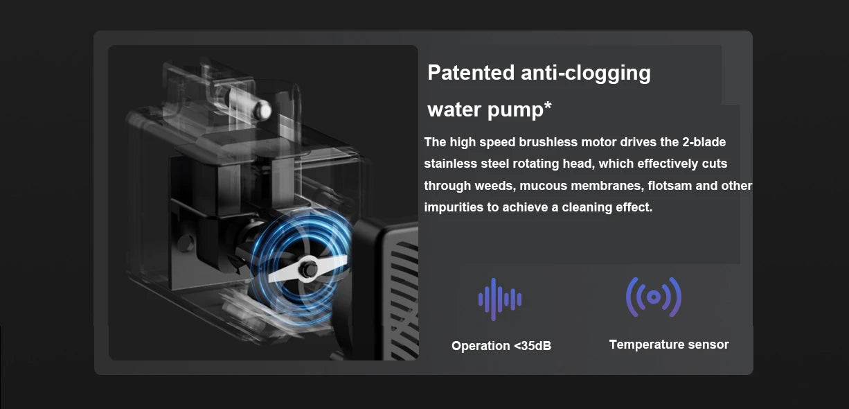 * Patented anti-blocking water pump, high-speed brushless motor drives 2-blade stainless steel rotating blade, which can effectively cut weeds, mucous membranes, floccules and other impurities